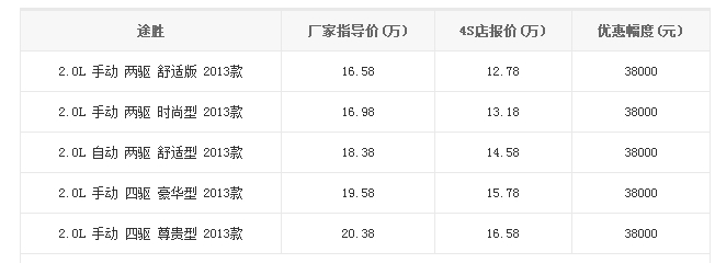 从临沂北京现代悦晟4S店了解到,途胜最高优惠3.8万元,现车特惠。具体降价明细如下表: