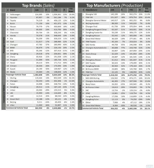 以下是LMC给出的乘用车品牌前20位6月份和上半年在华销量数据,按照上半年累计销量排序:
