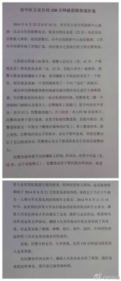 8月25日早8时54分,济南市市中区警方接到一名北京市民打来的报警电话。报警人称其女网友金某在济南被人绑架,请求警方帮助。