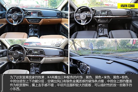 内饰方面,起亚K4量产版内饰造型风格稳重且精致。双层式中控台的各区域功能划分明确,容易上手;K4的多功能方向盘借鉴自K5,并配备全新仪表盘设计。此外,空调出风口的银色装饰以及木纹装饰面板也都突显了新车的质感。