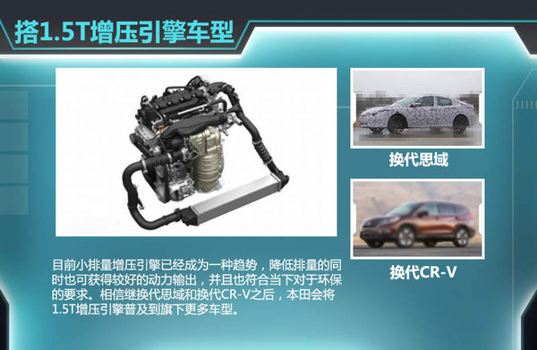 目前东风本田和广汽本田都还没有搭载涡轮增压引擎车型,本田1.5T直喷涡轮增压引擎此前在中国媒体大会中发布,据介绍,该增压引擎动力表现卓越,超过2.4L自然吸气引擎。换代思域将率先搭载1.5T增压引擎,而换代CR-V将紧随其后,排量降低的同时还可获得更加强劲的动力输出。