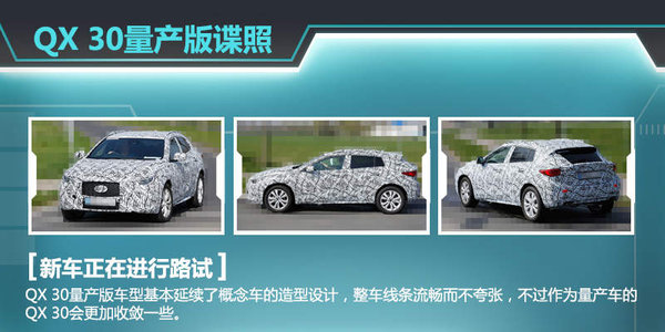随着东风英菲尼迪汽车有限公司的正式成立,中国市场在英菲尼迪全球市场中的地位再次提升,并且襄阳工厂也成为英菲尼迪全球第三个制造基地。加快推进新产品的引入与本土化生产,成为英菲尼迪在华追赶一线豪华品牌的重要策略。目前英菲尼迪在华仅完成了一款SUV车型QX50的本土化,未来还需导入更多SUV车型覆盖不同级别市场。近日,网通社从德国媒体auto-motor-und-sport获得了一组谍照并了解到,英菲尼迪全新紧凑级SUV QX30正在进行测试工作,其有望明年实现量产,新车的竞争对手将锁定宝马X1。而随着奔驰、宝马、奥迪三大豪华品牌紧凑级SUV的国产,未来该款新车也有望落户东风英菲尼迪的工厂。