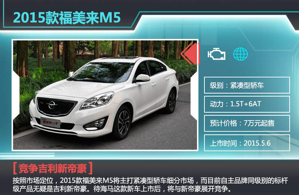 自去年北京国际车展发布上市以来,福美来M5便成为海马汽车主攻国内A+级家轿市场的重要车型。时隔一年后,其竞争对手纷纷完成更新换代,产品竞争力进一步增强。对此,海马汽车也展开相应部署,一款顺应目前“小排量增压化”潮流的全新年度款福美来M5即将正式登场。经过全新升级的2015福美来M5将向吉利新帝豪发起强力挑战。