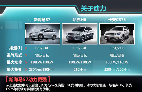 目前国内紧凑型SUV市场,哈弗H6、长安CS75堪称标杆级产品。待新海马S7投产后,将主要与它们形成对标。考虑到新海马S7在换搭1.8T引擎后,动力优势明显,因此只要定价合理,这款新车有机会抢占更多的市场份额。