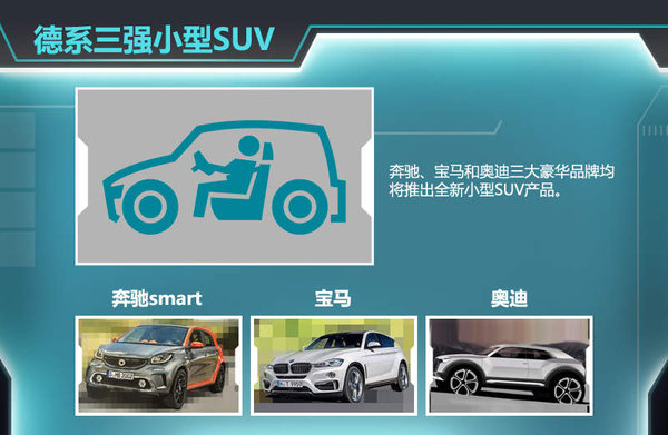 此前“德系三强”分别推出了各自的五年计划,其中显示彼此之间的“战火”将蔓延至更多细分市场,可以说奔驰、宝马、奥迪三大品牌的竞争又一次走向白热化。据了解,奔驰旗下子品牌smart将基于全新forfour车型打造一款定位在小型SUV市场的产品,而宝马则也将推出一款全新小型SUV,并基于最新UKL平台所打造,另外奥迪则也有望推出全新车型Q1。