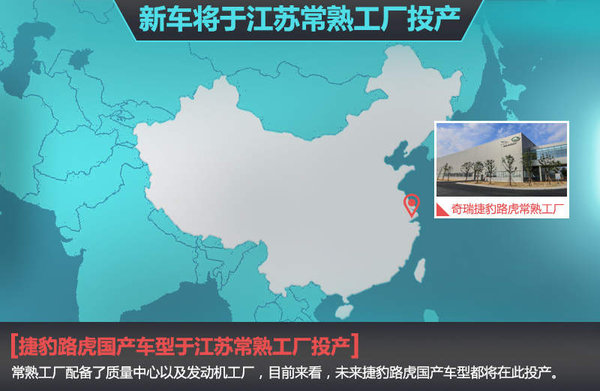 捷豹路虎首个英国以外的成规模整车制造工厂已落户中国江苏常熟,该厂由捷豹路虎与中方伙伴奇瑞共同投资建立,具备世界领先的生产设备及工艺。奇瑞捷豹路虎常熟工厂占地面积1,220亩,除冲压、焊装、涂装、总装四大车间外,还配备了质量中心以及发动机工厂,并拥有独特设计的点到点物流体系,以及独立的研发中心。据了解,除了路虎的两款车型揽胜极光与发现神行之外,未来捷豹的一款轿车产品也将在此投产。