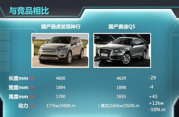 路虎发现神行的对手将是中型SUV细分市场中的奥迪Q5等车型。在尺寸方面,发现神行在长度和宽度两个方面都小于Q5,仅在高度方面占据优势。值得一提的是,在这样紧凑的空间内,发现神行居然还有7座版本,而奥迪Q5只有5座版本车型,让人不得不佩服路虎的设计能力。