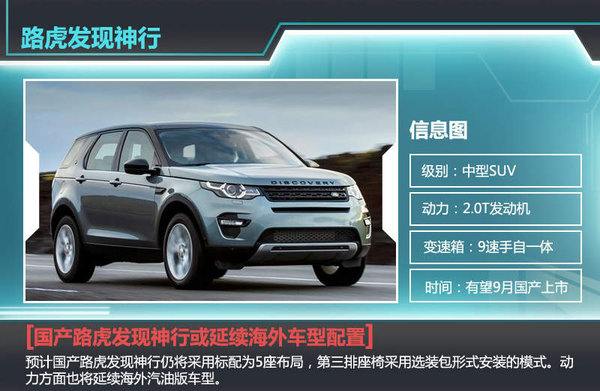 根据规划,到2016年奇瑞捷豹路虎在常熟工厂投产的车型将达到三款,产能提升至13万辆。今年一季度,路虎首款国产车型揽胜极光正式上市,年内捷豹路虎第二款国产车型也将推向市场。对此,奇瑞汽车董事长兼总经理尹同跃在与网通社社长李安定会晤时表示:“除了极光,今年9月份奇瑞捷豹路虎还会上市一款新车——7座的发现神行。”据了解,发现神行与揽胜极光基于同平台研发,但两者定位有所不同,该车的国产售价将比进口车型全面下调。未来该车上市后将与揽胜极光主攻不同SUV细分市场,而奥迪Q5将是发现神行的主要竞争对手。