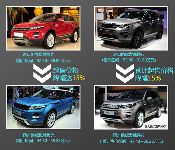 路虎发现神行是发现家族推出的首款产品,目前在国内以进口形式销售,两款车型售价分别为55.8万元和61.80万元。今年九月国产发现神行将正式上市。考虑到国产后,发现神行的制造、运输等成本下降与进口车关税取消因素,同时对比进口路虎揽胜极光国产后,起售价格降幅达到15%的情况,以此推算国产路虎发现神行价格起售价大约为47.43万元。