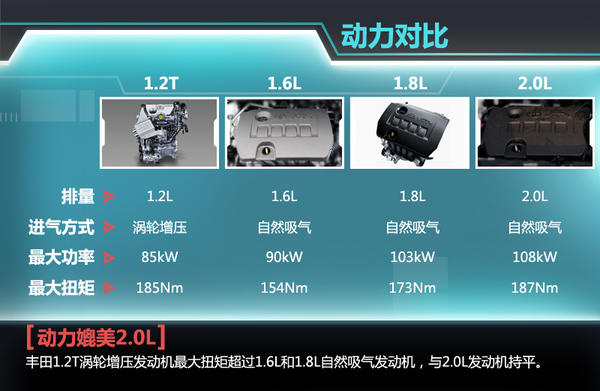丰田旗下目前拥有1.8L、1.6L、1.5L、1.3L等小排量发动机,以及2.0L、2.5L、3.0L等大排量发动机,通过对比1.2T与1.6L、1.8L和2.0L发动机的动力表现我们发现,1.2T涡轮增压引擎虽然在最大功率方面略显不足,但其最大扭矩超过1.6L和1.8L发动机,甚至与2.0L自然吸气发动机不相上下。目前小排量增压发动机已经成为一种趋势,相信丰田1.2T增压发动机会在旗下车型中得到普及。