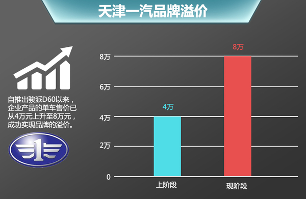 当前乘用车市场总体放缓,但 SUV车型销售却维持高增长态势,故而国内各大厂商纷纷涉足这一市场。天津一汽去年10月份也推出自己旗下首款SUV“骏派D60”,并取得了显著效果。据天津一汽官方数据显示,骏派D60推出以来,企业产品的单车售价已从4万元上升至8万元,成功实现品牌的溢价,这也使得天津一汽在严峻的市场现状下能够稍微松口气。