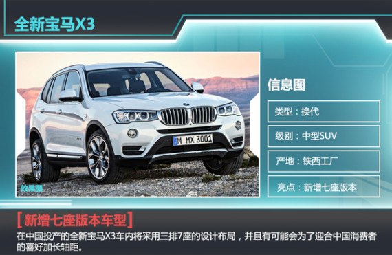 新一代的宝马X3将由研发全新宝马7系的“35up”后驱平台打造,新平台下这款车的车身尺寸上将得到进一步提升,轴距有望超过2,933mm,而现款宝马X5轴距为2933mm。全新X3将针对中国市场推出7座布局车型,以充分满足国内消费者对于空间以及实用性的需求。同时,该平台在车身技术上借鉴了宝马i系列的轻量化材料技术。全新X3在新平台技术支持下,相比现款有望减重180斤,在燃油经济性上表现更佳。动力方面,全新X3将搭载2.0T与3.0T发动机,还将推出混合动力车型。