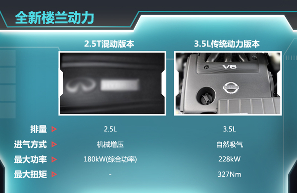 现款楼兰搭载3.5L V6自然吸气发动机,最大功率228kW,最大扭矩为327Nm,全新楼兰有望继续搭载这款发动机。目前日产豪华品牌英菲尼迪旗下QX60已经搭载2.5T机械增压油电混合动力系统,而全新楼兰将与之共享这套混动系统,其综合功率达到180kW,动力输出强劲。