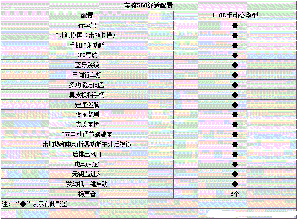 配置方面,宝骏560标配了ESC车身电子稳定系统、前排双安全气囊、倒车雷达、铝合金轮毂、行车电脑等。中配1.8L手动精英版配备了前排双侧气囊、8英寸触摸屏、倒车影像、定速巡航、蓝牙系统、手机映射功能、多功能方向盘等。顶配车型1.8L手动豪华版还配备了前驻车雷达、胎压监测、带加热和电动折叠功能车外后视镜、驾驶员侧玻璃一键上升、电动天窗、真皮换挡手柄、6向电动调节驾驶座、无钥匙进入、发动机一键启动以及GPS导航等。