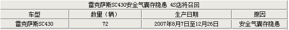 根据国家质检总局缺陷产品管理中心公布的消息,本次召回车型为2007年08月07日至2007年12月26日生产雷克萨斯SC430车型,涉及数量72辆。
