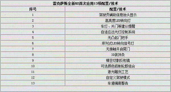 值得一提的是,雷克萨斯全新RX不仅设计前卫,该车的造车工艺也代表了雷克萨斯最高的水准,共有13项配置以及技术是在全新RX上首次应用。新增全彩抬头显示器HUD,该显示器拥有目前全球最大的展示尺寸(240x90mm),可显示温度、车速以及驾驶模式等信息,而驾驶者不必低头,就可以看到信息,从而避免分散对前方道路的注意力。此外,全新RX还首次应用了高亮度LED转向灯、无接触开启尾门、自定义驾驶模式等配置/技术。