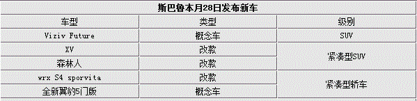 斯巴鲁5款新车本月28日发布 SUV占多数