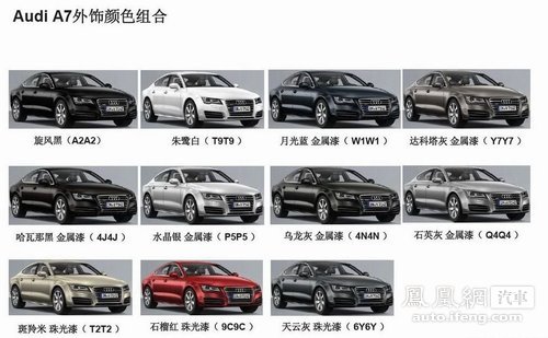 奥迪A7作为奥迪品牌的一个新的产品系列,是一款基于奥迪全新的中型车平台开发的四门Coupe车型,已提上国产日程的新一代奥迪A6L (详情 图片 报价)也将出自这一平台。从曝光的配置表来看,奥迪A7将推三款车型,分别为A7 2.8FSI进取型、A7 3.0TFSI舒适型和豪华型。从上图可以看出,共有11种颜色供消费者选择。