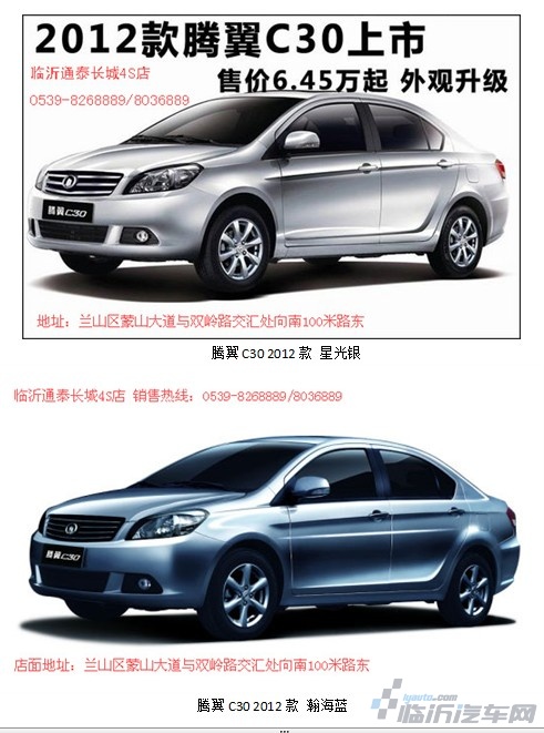 2011年8月18日,全面升级的“腾翼C30 2012款”车型已经到店,该车型在老款腾翼C30的基础上的全面升级。欢迎感兴趣的广大客户朋友前来赏车试驾。