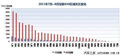 随着8月9日宝骏630的正式上市,其在汽车之家表现出较高的关注度,上升至紧凑型车级别关注度排行榜第9名。下面通过对比7月和8月的数据变化,简单分析一下宝骏630的上市在全国各区域取得的关注度差异,以及反映出的用户偏好。