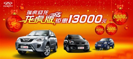 龙腾虎跃迎盛世,莺歌燕舞乐新年。为迎接2012年农历龙年的到来。即日起,临沂瑞驰特推出瑞虎龙虎版车型,最低86800元起售。活动期间,凡购买龙虎版即可享受3000节能补贴、5000元汽油卡在内,总计13000元超值钜惠!