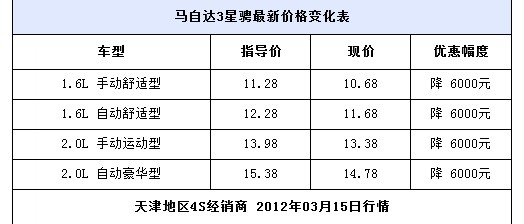 长安马自达3星骋外观时尚有型,配置丰富,底盘扎实,动力性和操控性表现不错。目前购车现金优惠6000元,喜欢此款车型的朋友可以和经销商联系购买。