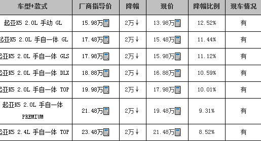 现在购买东风悦达起亚可享现金优惠20000元。现车方面:目前K5手动版无现车,其它车型库存充足,颜色有白色和银白色。店内有试驾车,可提供试乘试驾服务,感兴趣的朋友不妨到店详询。