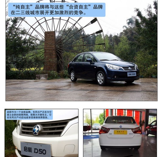 启辰的东风日产推出的自主品牌,其首款量产车型启辰D50也在北京车展上正式上市。启辰D50虽然使用了老款日产颐达车型技术,但重新设计的造型仍然形成了自己的特色,颇具攻击性的前脸和十分饱满的车身设计,都非常讨年轻人的喜欢。