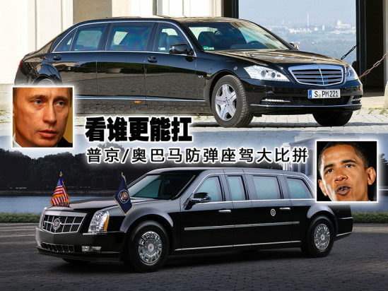 网易汽车5月9日报道 虽然冷战早已成为历史,但针对两个超级大国的对比依然时有发生,只不过是将其中一个主角从苏联换为了俄罗斯而已。前天普京第三度入主克林姆林宫,其座驾正是奔驰S600 Pullman防弹车。而在山的那边海的那边的那位肤色不同的美国总统却拥有着另一部同为黑色却是美国“自主品牌”的凯迪拉克帝威防弹车。