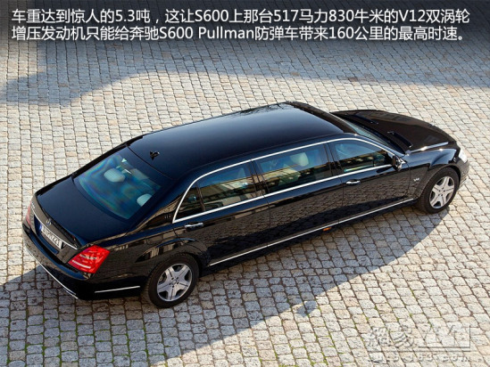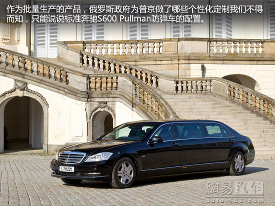 还是先来说说普京的这部奔驰S600 Pullman防弹车吧,作为批量生产的产品,俄罗斯政府为普京做了哪些个性化定制我们不得而知,只能说说标准奔驰S600 Pullman防弹车的配置。奔 驰S600 Pullman防弹车全长6356mm,轴距达到4315mm。车重达到惊人的5.3吨,这让S600上那台517马力830牛米的V12双涡轮增压发动机只能给奔驰S600 Pullman防弹车带来160公里的最高时速。