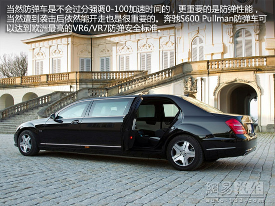 当然防弹车是不会过分强调0-100加速时间的,更重要的是防弹性能,当然遭到袭击后依然能开走也是很重要的。奔驰S600 Pullman防弹车可以达到欧洲最高的VR6/VR7防弹安全标准。当然作为汽车编辑还是知识有限,摘了段百科上对VR6/VR7的解释——“具体来说,五个手榴弹,其中三个M51手榴弹在车子下面,两个位于车顶,且同时爆炸,就算是这样的三明治式攻击也奈何它不得。如果这样还不放心,客户还可以为地板另外选装重达300公斤的装甲,它可有效抵御美制M61手榴弹的袭击。”