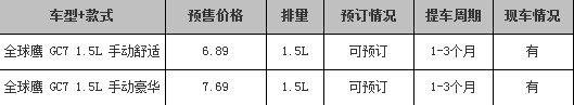 从临沂全球鹰汽车4S店了解到,GC7 1.5L车型现车已经到店,并可接受预定,订金为1万元,提车周期为1-3个月。到店现车方面,1.5L手动舒适、豪华型均有现车,且颜色齐全。感兴趣的朋友不妨到店内了解详情。