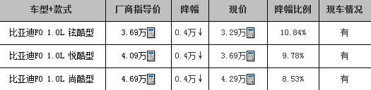 现在购买比亚迪F0可享现金优惠4000元。现车方面:目前店内现车充足,颜色齐全。店内有试驾车,欢迎感兴趣的朋友到店赏车试驾。