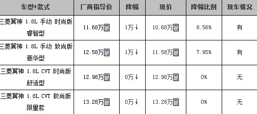 汽车编辑于临沂地区某东南三菱汽车4S店了解到,现在购买三菱翼神可享现金优惠10000元。现车方面:目前店内仅剩3台现车,颜色为白色和黑色,其它车型需要预定,定金10000元,约两周后提车。感兴趣的朋友不妨到店详询。