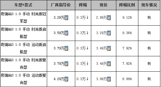 现在购买奇瑞QQ3可享3000元节能惠民补贴。现车方面:目前店内现车充足,颜色齐全。店内有试驾车,可试乘试驾。感兴趣的朋友不妨到店详询。