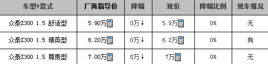近日,汽车编辑从众泰汽车某4S店了解到,Z300目前暂无现金优惠,购车赠送1000元保险或2000元礼包。礼包包含原厂太阳膜、地板革等。目前店内车型只有精英型现车,其他车型可以预订,订金2000元,1周左右可提车。具体请到店与销售商联系。