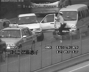 田传旭立即飞奔上前抓住了捷达车的左前门。此时,惊险的一幕出现了,捷达车司机竟拖着被挂在车门上的田传旭快速后退,一直将其拖行十多米后,捷达车撞向了中央护栏,田传旭被撞倒在护栏边,车门也掉了下来。这个过程持续了大约一分钟,之后,捷达车继续向东倒退着行驶30秒,将车停在距事发地点东侧约150米的铁路桥下后,一名三四十岁的男子和一名年轻女子从车内走出,两人跨过中央隔离带后,向东逃窜。