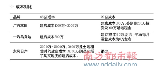 广汽本田副总经理郁俊亦认为,建一家2S店的基本费用是300万,投资是200万,租赁场地是100万,相比传统4S店的投资少了很多。
