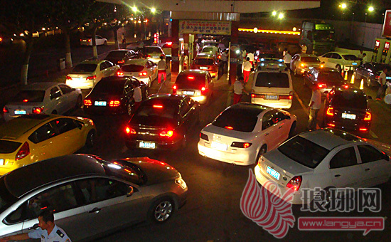 8月9日晚上8点多,临沂市区金雀山路一家加油站停满了等待加油的车辆,加油工说一晚上听到最多的俩字就是“加满”。 记者 邵琳 摄