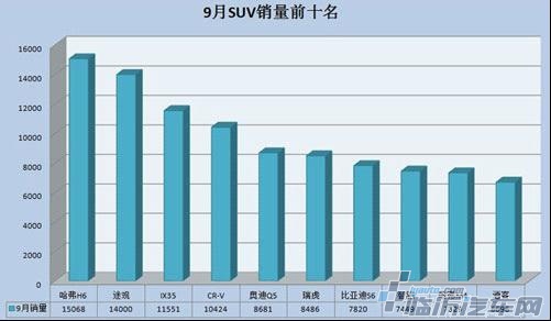 9月,中国SUV市场共计销售17.32万辆,同比增长17.1%,在销量排名上,除哈弗H6荣登冠军外,途观、ix35、CR-V以及奥迪Q5位列2-5位,分别销售14000辆、11551辆、10424辆、8681辆,前五位的车型共售出59724辆,占SUV车型总数的34.5%。