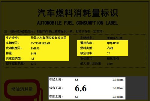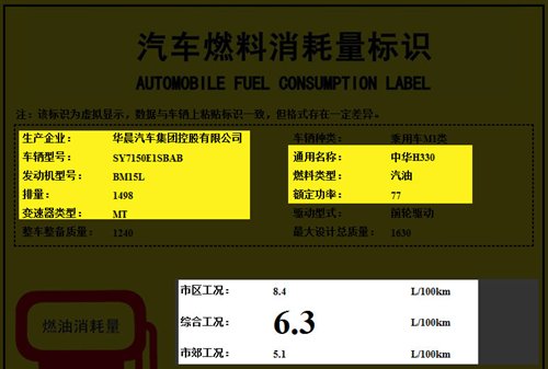 中华H330燃料消耗信息曝光 搭1.5L发动机