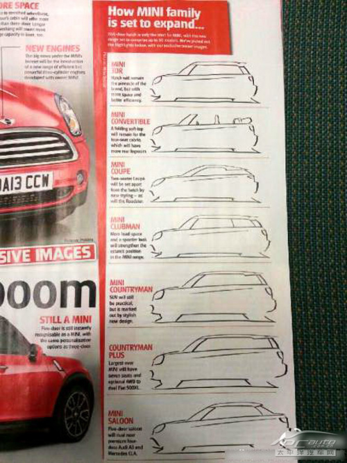 【临沂网汽车】近日,一幅海外杂志曝光的MINI未来新车规划图流传于新浪微博。从规划图中可知,除现有车型的换代产品外,三厢轿车、七座SUV/MPV车型也将加入MINI的产品阵营中。(图片来源:新浪微博)