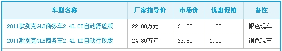 【临沂网汽车】近日,编辑从临沂悦新汽车销售服务有限公司获悉,别克GL8购车可享受1万元现金优惠,并额外赠送2万公里延长质保,仅限银色现车,截止日期为2012年11月30日。对别克GL8感兴趣的朋友不妨到店详询,也可关注其新浪官方微博“广汇临沂悦新别克”,获得店内最新优惠信息。