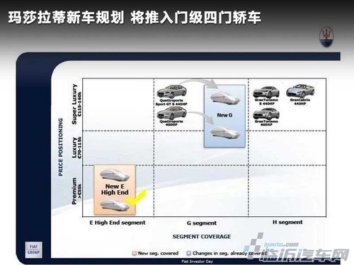 玛莎拉蒂作为来意大利的超级跑车品牌,旗下拥有总裁、GranTurismo及GranCabrio三个系列的产品,而接下来推出一款入门级四门轿跑车。据首席执行官Harald Jacob Wester接受媒体采访时表示,玛莎拉蒂将推出一款全新的E系列高端轿车,车身尺寸与奔驰E、宝马5相当,另外全新一代总裁将在2013年问世。