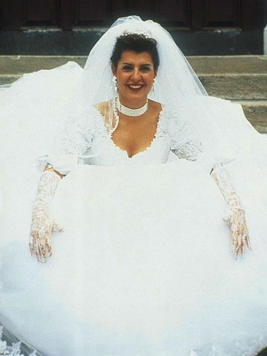 《我盛大的希腊婚礼(My Big Fat Greek Wedding)》。IanMiller(John Corbett饰演)说这套婚纱最适合他的新婚妻子Toula(NiaVardalos饰演):“你看起来就像一个大号冰霜纸杯蛋糕!”但是,Toula试图拉下庞大而繁复的礼服——就在蕾丝手套下方!你就会发现她天然的魅力所在。