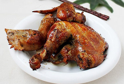 13.放一个铁箅子,将鸡(皮 向下)摆在箅子上,盖好锅盖,熏10分钟,再关火,继续盖着盖子熏15分钟。