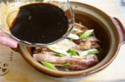 6. 把腌好的五花肉放入沙锅中,肉中间放一层葱、姜片,再放一层肉,将腌制肉片剩下的酱汁倒入锅里,加少许清水。