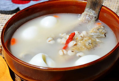 主料:鲫鱼500g 鹌鹑蛋10个 薏仁30g 枸杞20粒