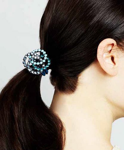 低调的马尾辫也是一些新娘可能会选择的发型,不过在婚礼时如果只是往后一扎未免太简单了,所以带有水钻装饰的发绳就可以为你的造型增加闪光点,而且颜色也可以选择比较跳跃的蓝色、粉色,好让发型给人简约不简单的印象。