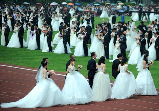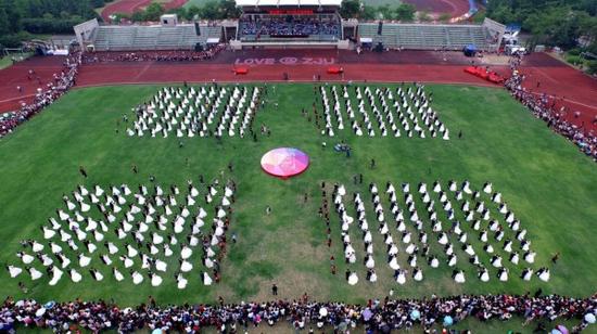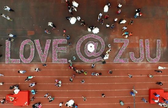 偌大的操场上,鲜花铺成了LOVE@ZJU,到处是身穿婚纱的美丽新娘,和身着西装的帅气新郎,在外围的还有新人们的亲友团和浙大师生。据了解,今天现场有5000人见证这一美好的时刻。参加婚礼的新人不仅有从全国17个省市自治区赶回来的,还有从俄罗斯、加拿大、新加坡赶来的。